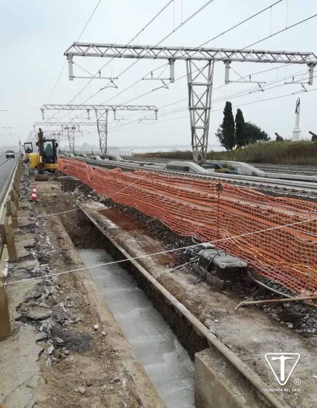 Lavori alle piazzole per la sosta di mezzi per manutenzione della linea ferroviaria Milano-Venezia, su via della Libertà nel Comune di Venezia.